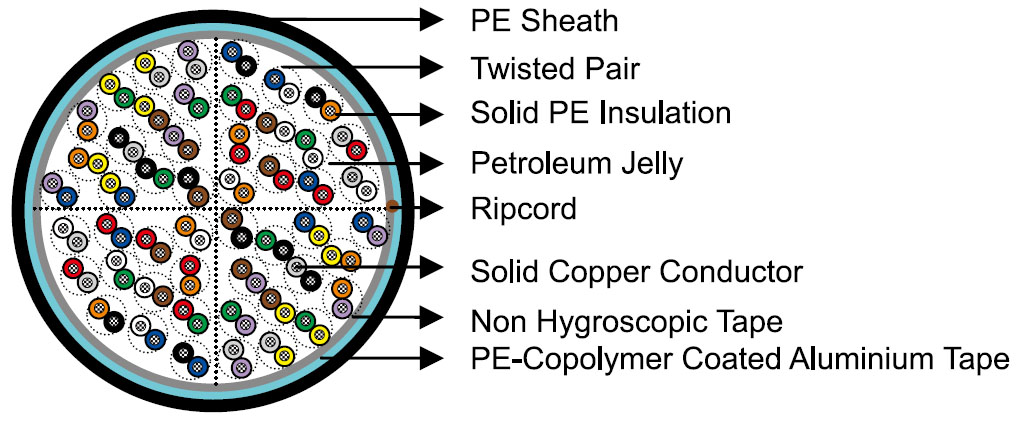 Cables of 25 pairs or less are assembled into cylindrical core. Cables larger than 25 pairs are assembled into units, which are then used to form the core. Units are identified by colour coded binders