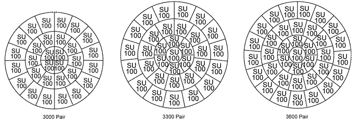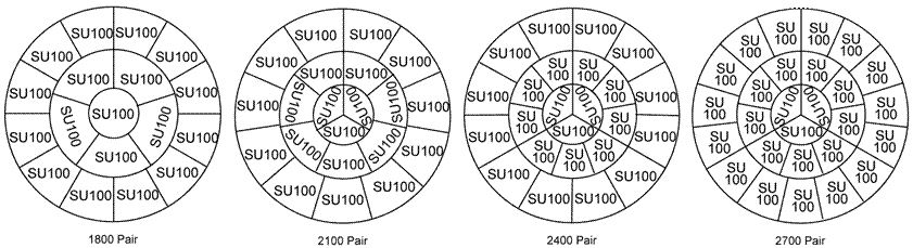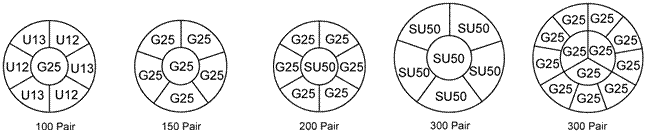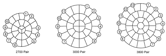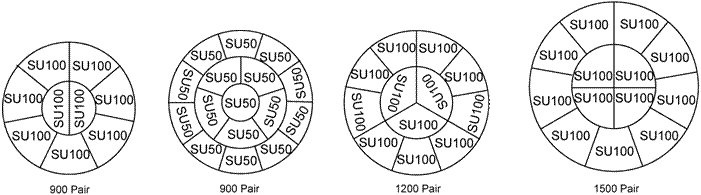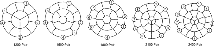 Mirror image telephone cable core constructions are available in 1200 pair or more cable designs, all of which use 100 pair super units.