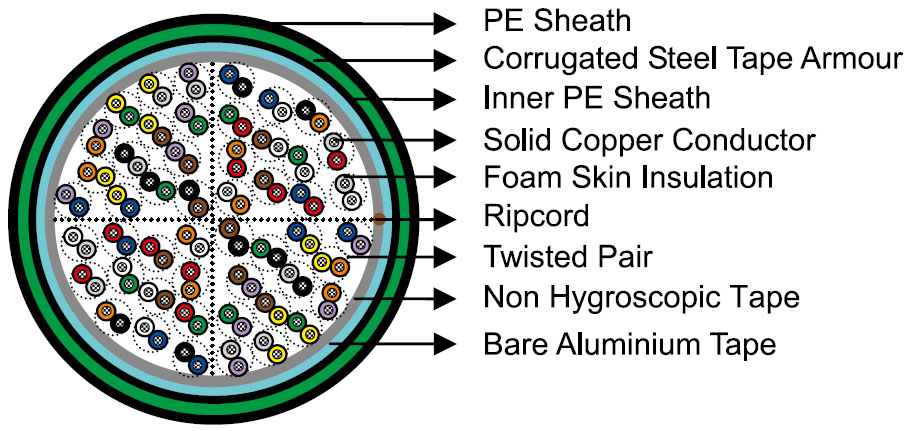 The cables are designed for use in access or trunk networks, from telephone exchange to subscriber area. The cables are suitable for installation in ducts, direct burial in the ground and also for aerial installation with integral suspension strand.Jelly filled option is for subscriber’s cables installed underground or along the edge of pavement. An armoured option is offered for direct burial installations where additional mechanical or rodent protection is required. A figure-8 self support option is offered for aerial installation.