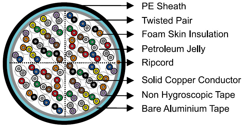 Cables of 25 pairs or less are assembled into cylindrical core. Cables larger than 25 pairs are assembled into units, which are then used to form the core. Units are identified by colour coded binders. Standard construction is per ICEA S-84-608 given in Cable Make Up Diagram