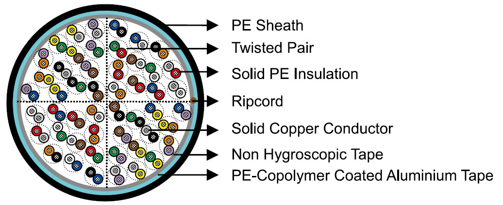 Cables of 25 pairs or less are assembled into cylindrical core. Cables larger than 25 pairs are assembled into units, which are then used to form the core. Units are identified by colour coded binders