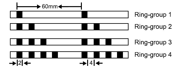 Each unit is assigned to one group of ring. All cores in each unit are marked with coloured rings and ring-groups.