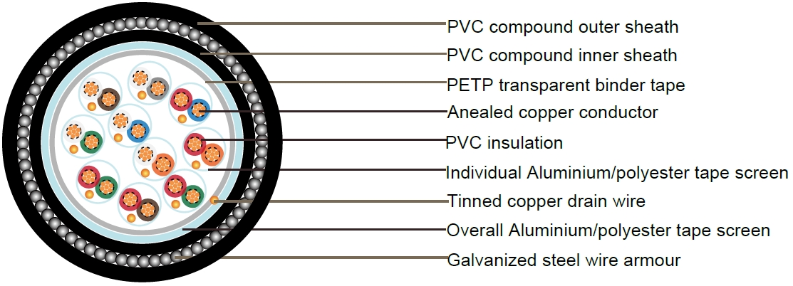 | Individual screen | Aluminium/polyester tape is applied over each pair metallic side down in contact with tinned copper drain wire, 0.5mm² |