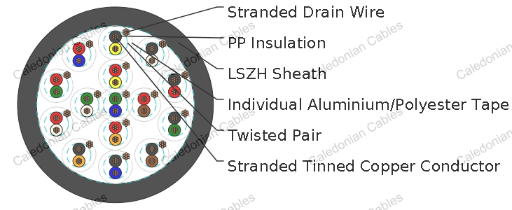 These cables have individually screened pairs laid up. Each individually screened pair has a 22AWG stranded tinned copper drain wire. These cables are used as computer cables.