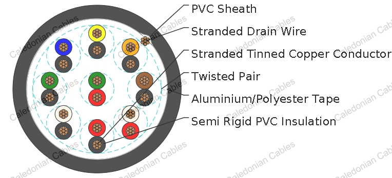 Conductor: Tinned copper wire. Insulation: Semi-Rigid PVC. Overall Screen: Aluminium/Polyester tape. Drain Wire: Tinned copper wire. Sheath: PVC (V type)/LSZH (H type). Insulation Colour: Black/Red, Black/White, Black/Green, Black/Blue, Black/Yellow, Black/Brown, Black/Orange, Red/White, Red/Green.