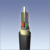 This cable offers the highest packing density, since all the fibers are laid out in rows, typically of 12 fibers, and laid on top of each other. This way 144 fibers only has a cross section of about 1/4 inch or 6 mm! Some cable designs use a "slotted core" with up to 6 of these 144 fiber ribbon assemblies for 864 fibers in one cable! Since it's outside plant cable, it's gel-filled for water blocking.