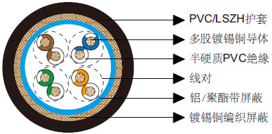 该电缆由对绞线绞合成缆,外层为铝箔总屏蔽加铜丝编织总屏蔽。适用于RS-232和CAD/CAM应用,用作计算机电缆。